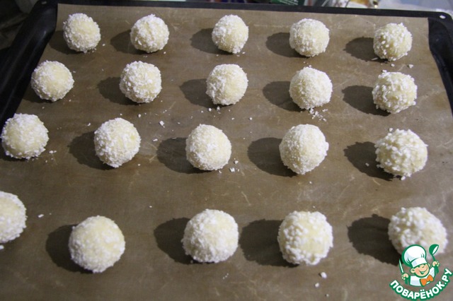 Сформировать вновь шарики и обвалять в кокосовой стружке и выложить на противень. Выпекать около 12 - 15 минут.