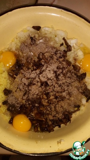 • Когда грибы пристыли соединяем лук, грибы, тертый картофель, добавляем соль, перец (специи по вкусу) и вбиваем яйца
