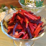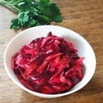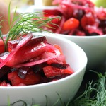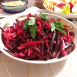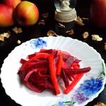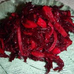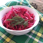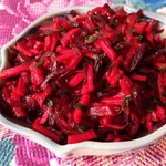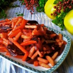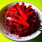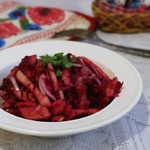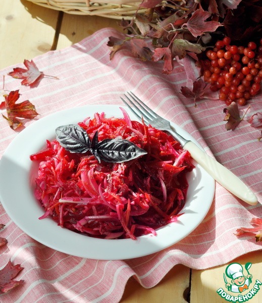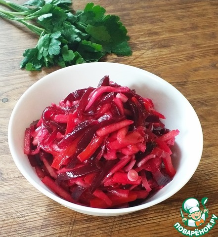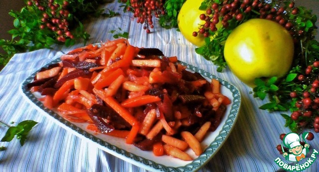 Слегка остуженные свеклу и морковь порезать соломкой (или натереть на терке для картофеля-фри). Добавить слегка отжатый лук с яблоками.