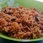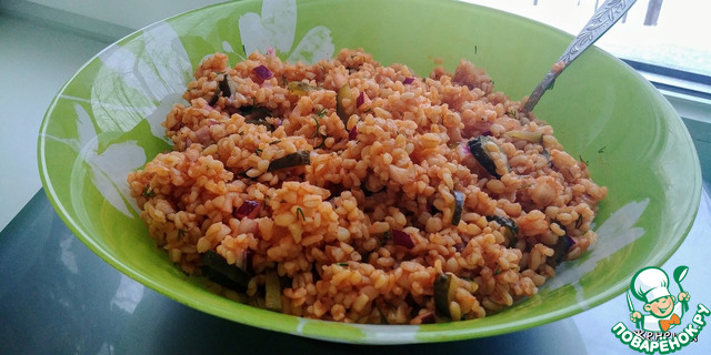 После того как булгур впитает всю воду и размягчится, перемешать его с томатным соусом.