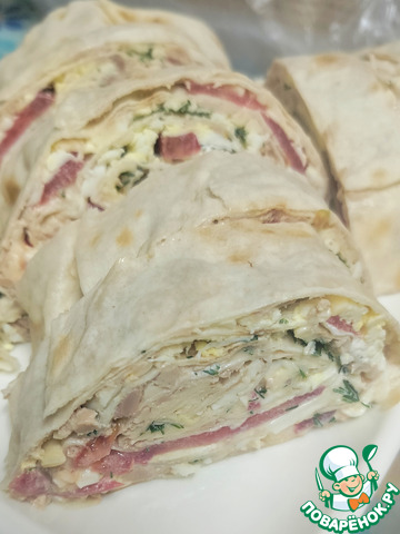 Делала одинарный лаваш. Майонез заменила сметаной. Остальное по рецепту.