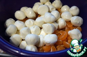 • Из сыра слить рассол, выложить шарики целыми к мандаринам.