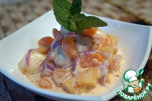 • С веточек мяты снять листья (оставить для украшения трилистник), мелко порубить, добавить в салат. Заправить салат йогуртом, перемешать – и подавать.