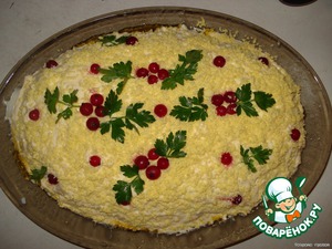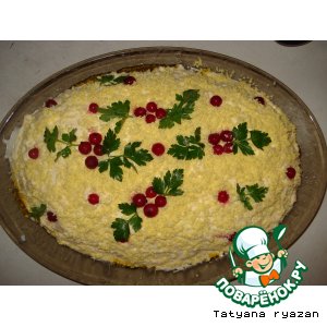 Украсить по своему усмотрению. Я украсила яичными желтками, ягодами красной смородины, и петрушкой.