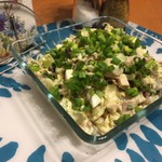 Выложить все ингредиенты в большой салатник, добавить измельченный зеленый лук, заправить соусом (сметаной или майонезом).