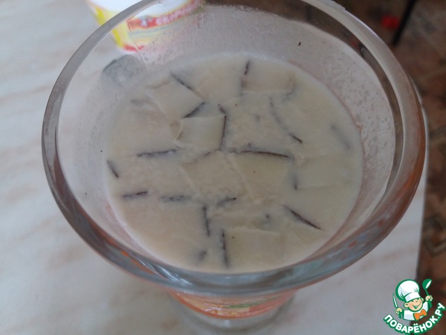 В стаканы для десерта нарезать не большими кусочками яблоко и посыпать корицей = залить молоком с желатином и отправить в холодильник.