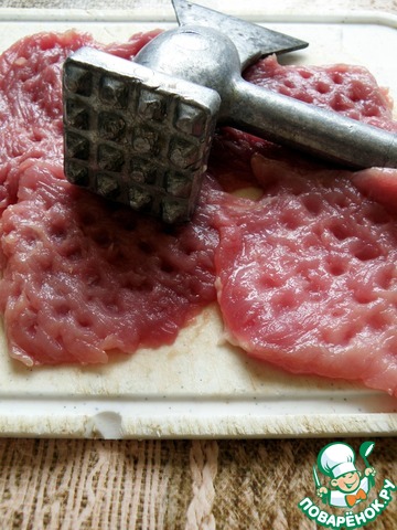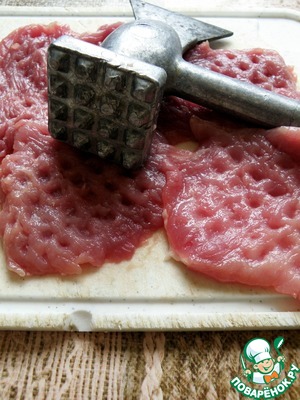 Свинину обмыть ледяной водой и хорошо обсушить. Нарезать на отбивные и хорошо отбить. У меня были мелковатые антрекоты, не слишком удобно в них заворачивать. Лучше брать кусочки побольше, но постные.