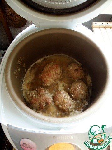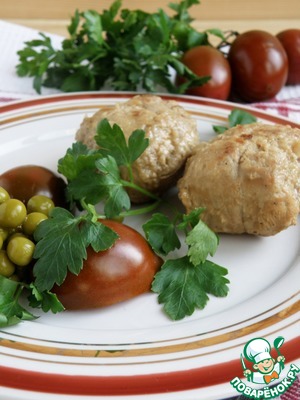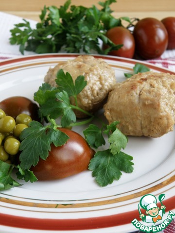 Завернуть половинки яиц в отбивные. У меня из-за размера пришлось брать по две и еще нитками завязывать.