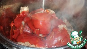В кастрюле с толстым дном разогреть сливочное и оливковое масла, добавить и пассеровать слегка лук. Выложить кусочки мяса и пассеровать по несколько минут с каждой стороны. Добавляем томатный сок и помидор. Перчим, добавляем сахар. Варим на среднем огне до мягкости мяса. В конце добавляем перец болгарский и соль и провариваем немного. Этот этап намного упростится, если для варки мяса воспользуемся скороваркой.