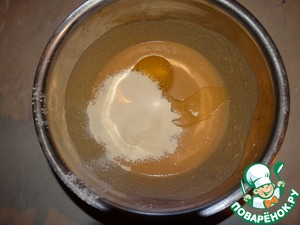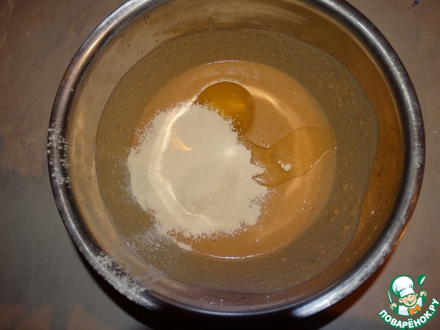 Добавляем яйцо, немного муки, подсолнечное масло. Хорошо смешиваем. Тесто должно получиться чуть-чуть гуще, чем на обычные блины. После чего ждем еще 5 минут и начинаем выпекать.
