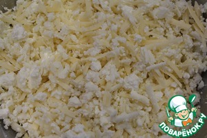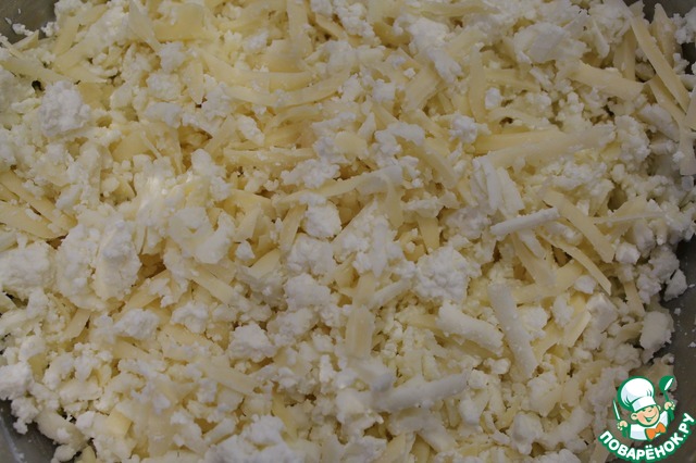 Готовим начинку, для этого натереть сыр на крупной терке и смешать с творогом, можно добавить соль по вкусу.
