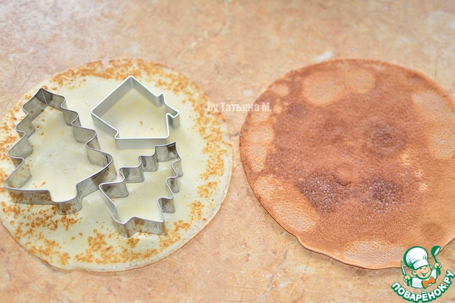 Одинаковые фигурки вырезаем из белого и темного блина и меняем местами в прорези: в белый блин - темные фигурки и наоборот. -
