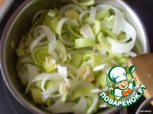 В кастрюльку кладём маргарин, когда растопился закладываем порей, и тушим примерно 5 минут.