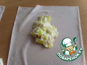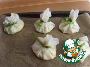 Закрываем в виде мешочка и завязываем зеленым луком.