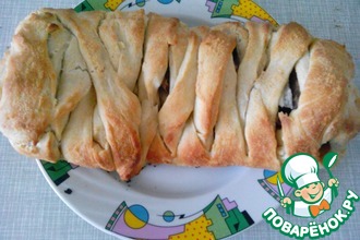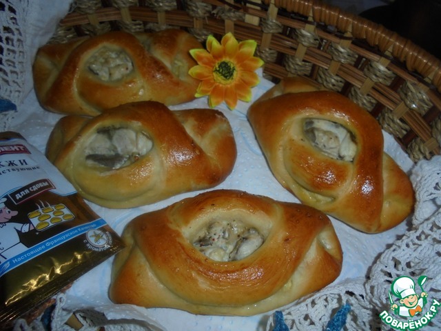 Затем возьмите края лепешки, те, на которых сделаны надрезы. И аккуратно проденьте один край в надрез, таким образом, чтобы оба края ушли в противоположную сторону, а посередине получилось круглое отверстие. Таким образом сфрмировать все пирожки. Выложить на противень, смазанный маслом. Дать расстояться 25-30 минут. Смазать кулебяки взбитым яичный желтком.