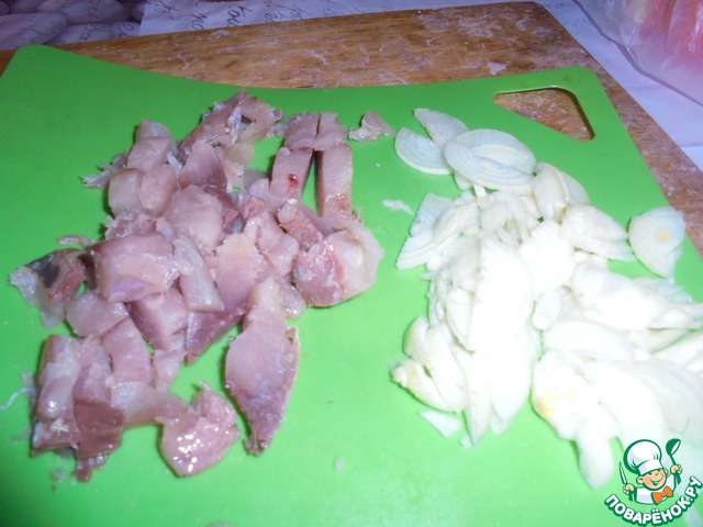 Для начинки приготовьте рыбу-нарежьте его на кусочки. Лук репчатый очистите.