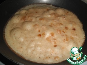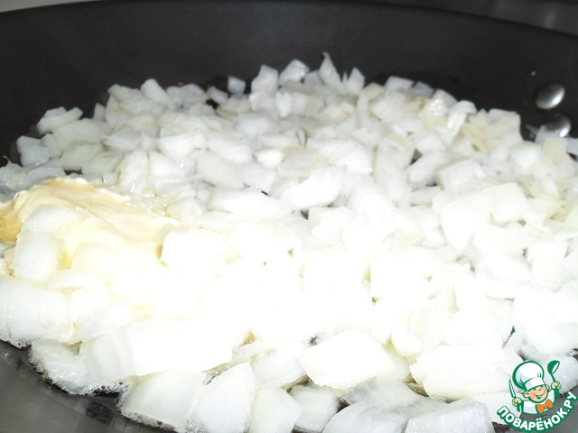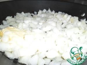 Подготовим для блинчиков "запёк". Две большие луковицы очистить и нарезать средним кубиком. В нагретую сковороду положить сливочное масло или маргарин (к празднику, пожалуй, маслице надо), туда же отправить лук, когда он хорошо подрумянится.
