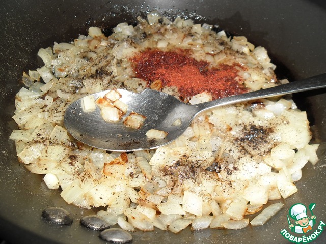 Добавить черный молотый перец и паприку молотую, поджарить её до характерного аромата. Перемешать, лук вместе со специями обжарить на слабом огне. Затем посолить по своему вкусу, дать настоятся, охладить.