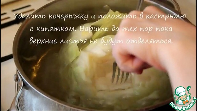 Удалить кочерыжку у капусты и положить в кастрюлю с кипятком. Варить до тех пор пока верхние листья капусты не будут отделяться. Отделившиеся листья выложить на тарелку.