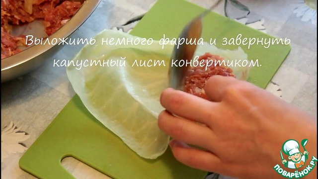 Выложить немного фарша на капустный лист и завернуть его конвертиком.