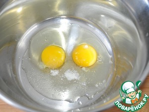 Готовим тесто для блинов. В миску разбиваем яйца, кладём соль, сахар, взбиваем слегка венчиком или миксером.