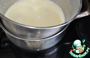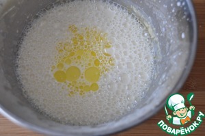 Добавляем молоко к яйцам с мукой и дрожжами, перемешиваем, взбиваем до растворения комочков, добавляем растительное масло. Тесто должно получиться жидким, в процессе брожения оно станет гуще.