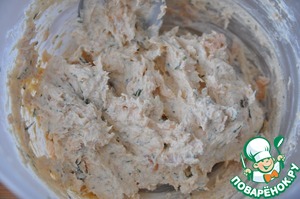 Берём творожный сыр. Добавляем к нему кусочки малосольного или копчёного лосося, у меня копчёная кета. Кладём чеснок, укроп (у меня мороженный), паприку и всё слегка пробиваем блендером.