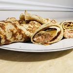 Берём блин, кладём на край 2 ст. ложки начинки, заворачиваем края и сворачиваем в рулетик.