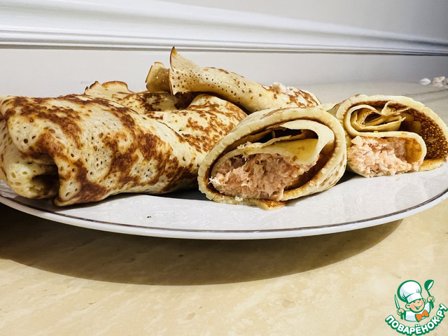 Подаём фаршированные рийетом блины, как холодную закуску.