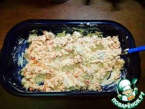 • Выбираем противень и делаем в нём крем из рикотты (рекомендую разбавить её небольшим количеством воды) и тунца (сок или масло не вылевайте, наоборот добавьте в крем). По желанию и вкусу добавьте зелень, соль, перец.