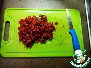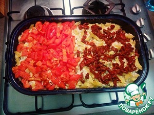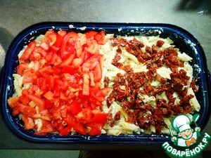 • На поверхность разделяем томаты. Вы можете использовать только сушенные или исключительно свежие, я сделала пополам.