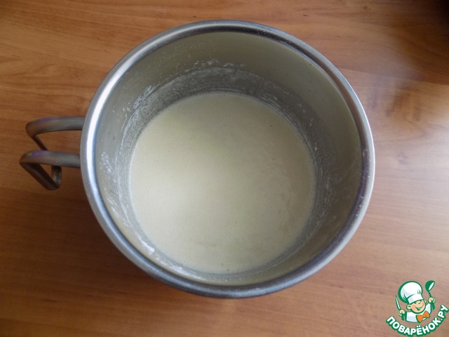 Делаем тесто. Молоко разбавила горячей водой и оно стало тёплым. Положила сахар и дрожжи, размешала венчиком.
