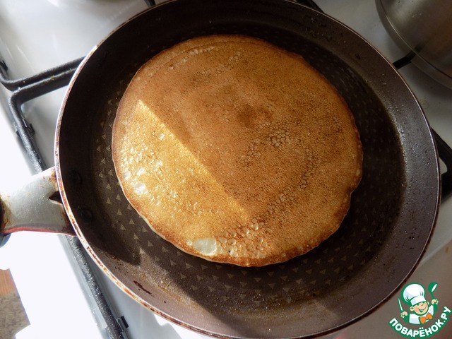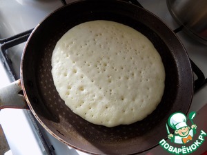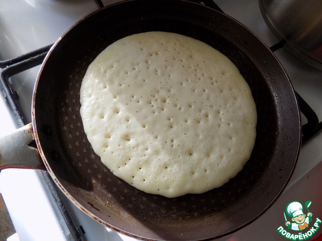 Жарим блины. На один блин -0,5 поварёшки. Сковороду разогреваем сильно и обязательно подмазываем её для выпечки всех блинов, несмотря на масло в тесте. Разливаем пол-поварёшки теста по центру сковороды, оно хорошо растечётся и получится блин, размером, который нам нужен для пирога. Вот такой красивый дырчатый блин получился. Когда он схватится...