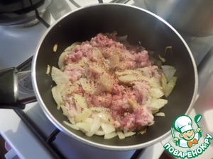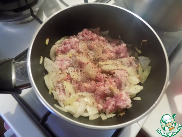 Пока стояла опара "на подъёме", я параллельно сделала начинку для пирога. В сотейник налила масла и чуть позолотила большую луковицу, порезанную тонко. Выложила фарш мясной. К сожалению не было у меня готового отварного мяса, из которого можно было бы сделать фарш. Из отварного мяса фарш в начинку пирога для меня вкусней. Ну да и ладно! Я обжарила сырой фарш вместе с луком немного.