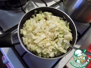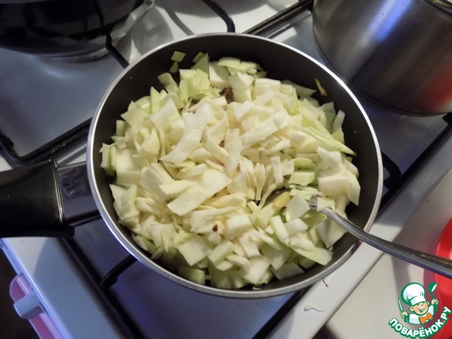 Затем добавила порезанную мелко капусту и всё вместе потомила. Кто ест жареную еду, то можно всё посильней обжарить. Посолила и поперчила по вкусу, перемешала и доделала ещё пару минут.