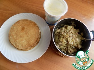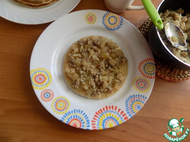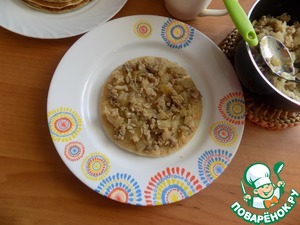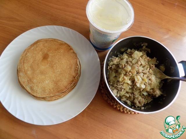 Выкладываем второй блин. На него-капусту с фаршем... и т д... чередуем.