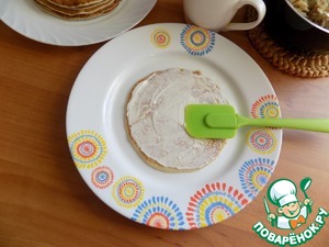 Начинаем собирать пирог. Нам понадобится блюдо или тарелка, которую мы спокойно сможем поставить в духовку. Выкладываем блин и промазываем первый слой сметаной.