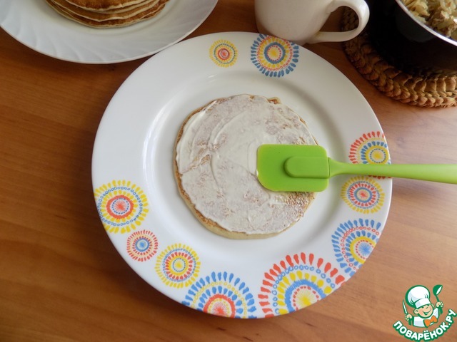 Блины у нас готовы. Из этого количества теста получилось 9 шт блинов D~15 см. Начинка тоже готова.