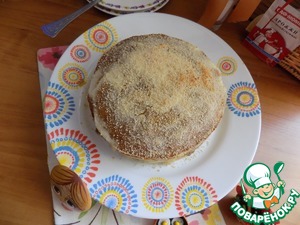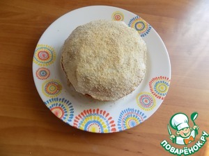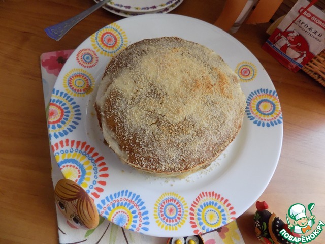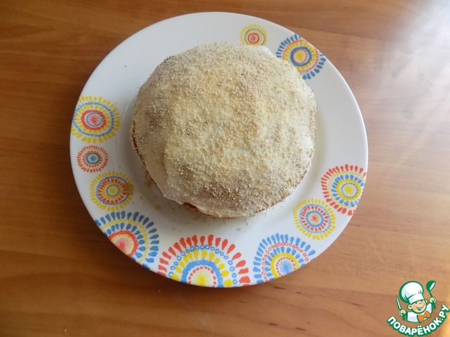 Последний слой, а это верх-сметана. Присыпаем сметанный верх размолотыми белыми сухарями и ставим в духовку пирог на 15 минут при т-180 С.
