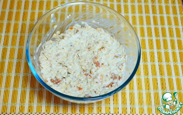 • Овсяные хлопья залить кефиром, добавить яйцо, яблоко, растительное масло, соду, разрыхлитель. Перемешать. Добавить курагу. Перемешать.