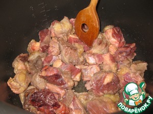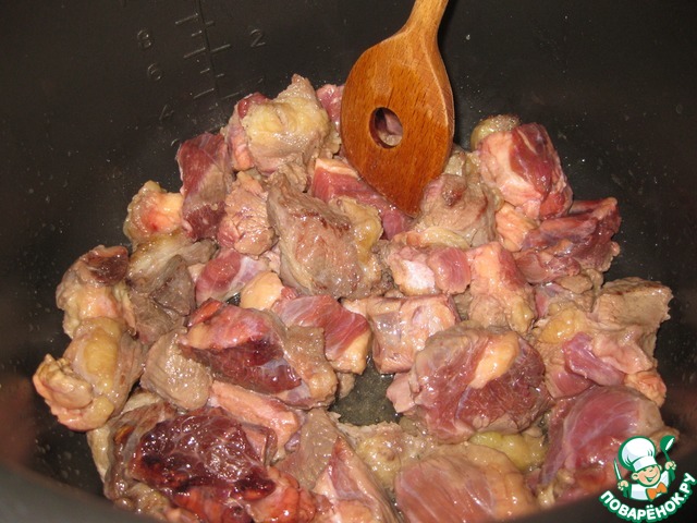 Включаем МВ на режим "Жарка/Фритюр", наливаем растительное масло, ждем звукового сигнала и выкладываем мясо, нарезанное кусочками примерно с половину спичечного коробка (не мелко!), мясо желательно брать с жирком, - у меня было с шейной части, - обжариваем до коричневой корочки.