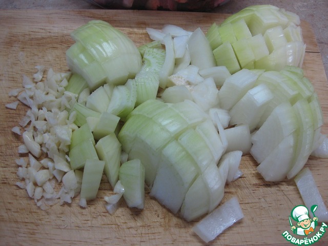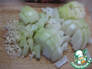 Лук нарезать не мелким кубиком, чеснок очистить, раздавить каждый зубчик плоской стороной ножа и затем мелко нарезать