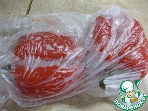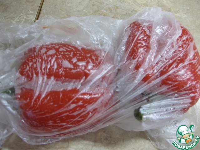 Не забываем помешивать мясо, ав это время перцы помыть и запечь в духовке до подпалин, либо как я, запечь в микроволновке минут 15-20, - горячие перцы выложить в пакет минут на 10, затем очистить от семян и шкурки