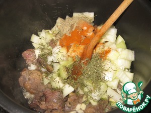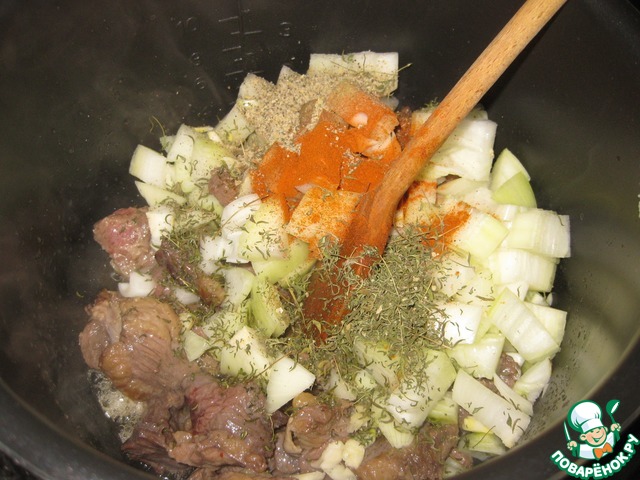 Все перемешать, добавить лаврушку, выправить на соль-сахар, и переключить в режим "Тушения" на 40 минут.