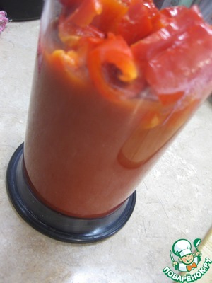 Тем временем приготовим соус, - томатную пасту разведем водой с стакане для погружного блендера, туда же выложим кусочки очищенного запеченного перца, - все пюрируем до однородной массы