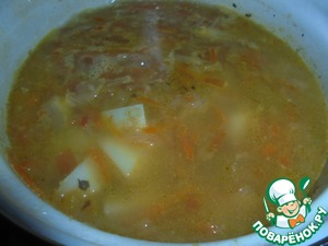 За 5 минут до готовности супа добавьте перец горошком, лавровый лист. -