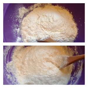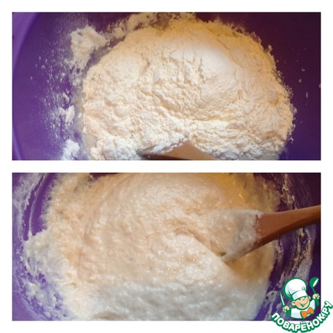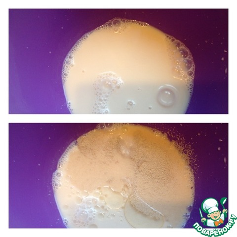 Влить ряженку и кипяток. Всыпать щепотку соли и сахар, перемешать. Добавить дрожжи.