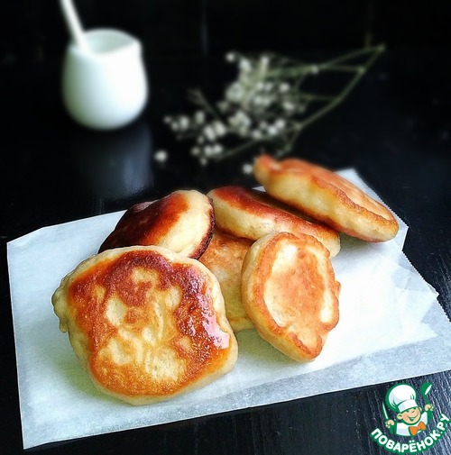Всыпать муку и вымесить тесто. Оставить в теплом месте на 40 минут до увеличения теста в объеме. Подошедшее тесто перемешать ложкой и выпекать оладьи с двух сторон на хорошо разогретой сковороде в достаточном количестве растительного масла.