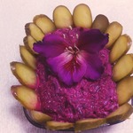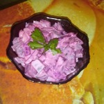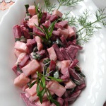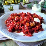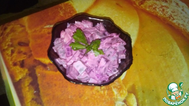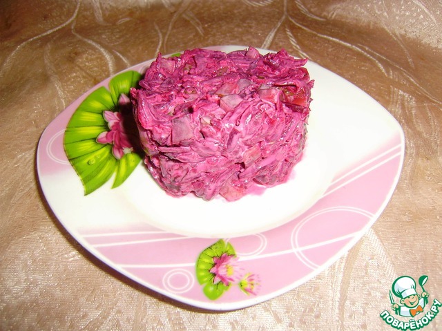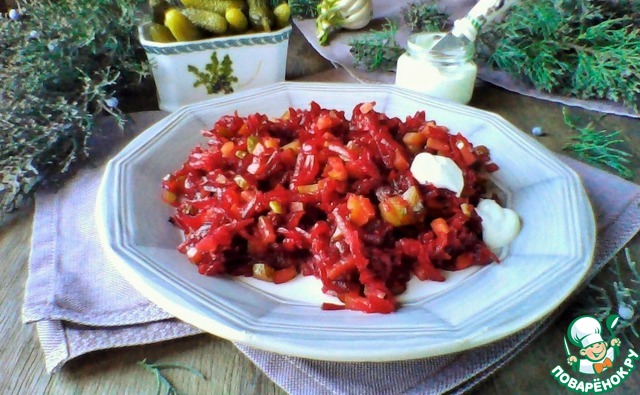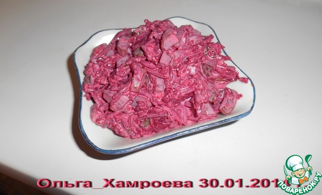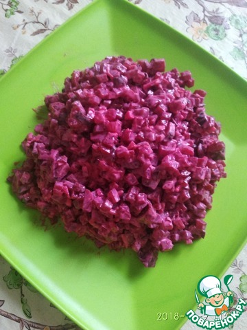 Перемешиваем, заправляем майонезом с чесноком. То есть чеснок измельчаем любым способом (на терке, в давилке), перемешиваем с майонезом и заправляем свеклу. Так как салатик очень любит давать сок, заранее лучше не заправлять.