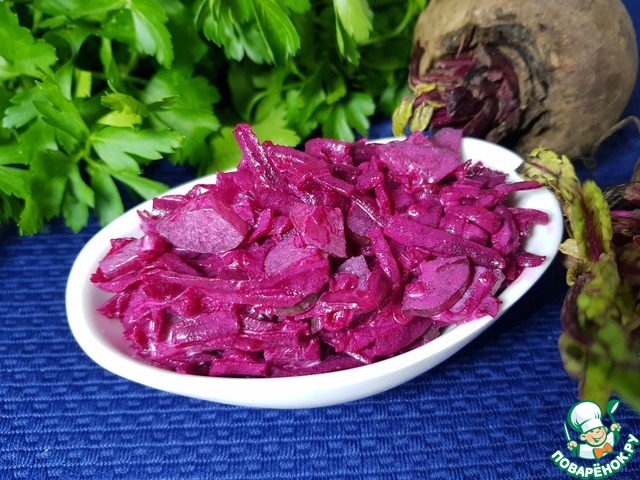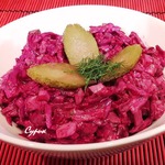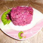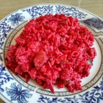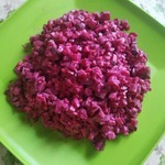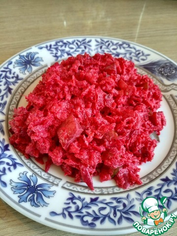 Варим свеклу (кладем свеклу в холодную воду и кипятим часика 2, периодически протыкая ножиком - если нож легко входит в свеклину - готово). Сливаем кипяток, заливаем свеклу на некоторое время холодной водой - будет мягче и почистится легче. Только не оставлять надолго - весь сок в воду уйдет. Чистим свеклу, натираем на крупной терке, дает стечь лишнему соку.